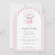 Söta rosa-golv omger en möhippa-bricka. Enkelt, elegant Fransk rand i bakgrunden till denna klassbåge. Färg är fullkomligt feminin med elegant och vackra drag och typografi. Centrerad med "Möhippa" i stil med skräddarsydd kalligrafi. Vit och mjuk pastellbaksida, rosa strimlad baksida på framsidan och baksidan, med petaler och Prosecco-glas på mittenbaksidan.