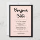 Den här eleganten, Parisian couture inspirerade barnduschinbjudningar säger "bonjour bébé" i chicens svarta typografi. En mjuk, rosa omges av ett modernt svart gräns.