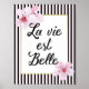Denna feminin, chic poster Fransken "La vie est Belle", eller "Life is Vacker" i svart elegant med en faux guld foil tunn ram. Gräns i den poster som görs av Parisisk svart och rosa rand, och vackra illustrerade körsbärsblommar dekorerar hörnen.