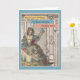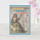 Kvinna i fransk klänning för vintage med den breda kjolen och delar colorized in i blått, rosor och gult. Hon är hållande en spegel och ett anseende för mycket utsmyckade väggdekorationer. Ovanför i rektanglar, om gult, rosor och blått "maj alla dina födelsedagar är fantastiskt lycklig en",