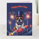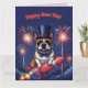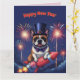 hübsche französische Bulldogge feiert Sylvester und wünscht ein Frohes Neues Jahr. Das bunte Feuerwerk in der Nacht wirkt sehr festlich.Der lustige kleine Hund hat sich schön gekleidet mit Fliege und bunten Zylinder für diesen traumhaften Abend. Der niedliche Frenchie sitzt auf einer Rakete und startet ins neue Jahr. Jetzt wird gefeiert und um 12 Uhr Mitternacht wird mit Sekt angestoßen. Traumhafte Illustrationen und ein schönes Geschenk für jeden Hundebesitzer.