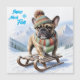 Französische Bulldogge macht eine Schlittenfahrt im Schnee. Mit Pudelmütze, Schal und warmer Kleidung beginnt die Rodelfahrt im Gebirge für den kleinen Hund. Endlich Schnee zu Weihnachen, der kleine Frenchie freut sich.