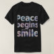 Gör fred till en del av din dag med "Peace Begins with a Smile" t-shirt. Med mjukt, rundat typsnitt och färg med mjukt, flytande mönster som moln och virvelvinklar ger den här utformningen en lugnande och positiv visuell effekt.