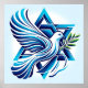 Detta fantastiska biet har en graciös duva mitt under flygningen, dess utspridning i vingar och en levande grönt i gren som på ett skickligt sätt symboliserar hoppet. Doven, som återges i mjuka vita tonar, kontrasterar vackert mot bakgrunden av en stark blå stjärna av David, som fångar öga och hjärtat med dess djup och betydelse.