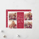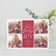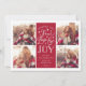 Modern typografi-baserad helgdag-fotokort innehåller fyra av dina favoritfoton i fyrkantigt format, med "Peace, Kärlek and Joy" centrerat i vit handskriven stil-typografi. Anpassa med din familj namn, namn och/eller ditt anpassningsbar julbudskap. Kort bakåt till mönster i vitt snö och stjärnor på kranbärsröd bakgrund.