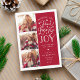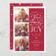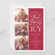 Fina typografibaserade fotokort med helgdag har tre av dina favoritfoton i en kvadratisk form längs den lämnat sidan. "Önskar du fred, kärlek och glädje denna jul och alltid" visas på högerna med vit, sliten typografi på en kranröd bakgrund som prickas med festliga stjärnor. Anpassa med hälsning, namn, namn och året. Kort bakåt till en mönster av vit snö och stjärnor på röd bakgrund.