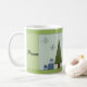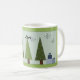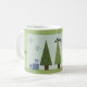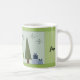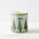 Viktig grönt Julgranar med söt inslaget paket i blått. Att dansa snöflingor och underbart ord, fred, glädje och kärlek accentuerar detta koncept. Snygg jul mugg att lägga till i din samling eller ge.