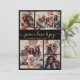 Minimalistisk modern svart och guld 5-bilds collage "Fred, kärlek och glädje" julkort. Detta eleganta julkort har en 5-bilds collage på framsidan och ytterligare ett foto på baksidan. Meddelandet "Fred, kärlek och glädje" är vackert handskrivet i (falsk) guld kalligrafi på en snygg svart bakgrund, vilket ger en touch av sofistikering till dina högtidliga hälsningar. Baksidan innehåller en anpassningsbar hälsningsmall med ett hjärndoodle-motiv och utrymme för ytterligare ett foto. Perfekt för att dela julminnen med familj och vänner, detta personliga kort ger festlig glädje till julen.