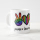Höj din morgonrutin med "Peace, Kärlek & Equality Giant Coffee Mugg". Den här överdimensionerade mugg är perfekt för både kaffe och te älskare. Dess sjudande utformning förmedlar ett kraftfullt budskap om rättvisa och positivitet i social, och skapar den som en tankefull gåva till vänner och familj. Med en stor kapacitet och en hållbar konstruktion är den både praktisk och inspirerande - perfekt för din morgonritual eller som en utmärkt biet i din hemdekoration. Sitt målmedvetet och främja ett budskap om kärlek och jämlikhet varje dag! Att säga - fred, Kärlek och jämlikhet. Ett färglöst mugg som visar fredstecken, hjärta och mun.