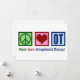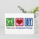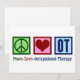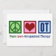 Ett snyggt julkort för arbetsterapeuter med en grön fredstecken, rött hjärta och OT skrivet i blått på en blå bakgrund. Arbetsterapi är en så viktig yrke. Det hjälper både vuxna och barn med sensorisk terapi.