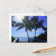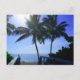 Sol blundar genom toppar i handflatan träd och bildar en silhuett mot ett tydligt blå himmel. Tidigare bron ljuger kusten och en lugn, blå hav.