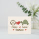 Om du älskar din husdjurssköldpadda eller vill sprida budskapet om att rädda utrotningshotade djur som lädersköldpadda, kommer du att älska vår fredssymbol, hjärta och grön sköldpadda på t-shirts, tees, klistermärken, knappar, brevpapper och andra föremål som gör den perfekta presenten för en sköldpaddsentusiast. Klicka på följande länk för att se alla Chrissy H.