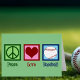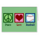 Cute Peace Baseball-kort i Kärlek med coolans fredstecken, hjärta och boll för sportfantaster, spelare eller till och med din lilla ligagtränare. Ett fantastisk basebolljulkort i grönt.