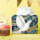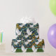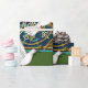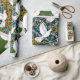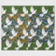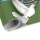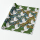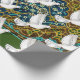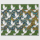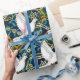 FREDDUVA SOM SLÅR IN PAPPER I GRÖNT OCH BLÅTT.