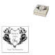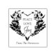 Elegant julgummi frimärke med en blommigt hjärtkrans runt ord Peace, Kärlek, Joy. Personlig med din familj namn är detta festliga frimärke perfekt för att dekorera helgdagskort, kuvert, presentmärkre eller paket. En tidlös svartvit design som gör att du får en snyggt, återanvändbar och miljövänlig beröring till dina julbrevsprogram och helgdag.