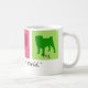 Fredkärlekmops. Tre hund älskaresilhouettes i en ro, en fredstecken i mjuka blått, en röd kärlekhjärta och en kinesisk mops skisserar i grönt med ord den perfekta världen.