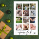 Skicka din anpassningsbar Jul önskemål till din familj och dina vänner och visa dina favoritstunder från i år! Och ta med "fred" till dina kära i Julhelgen! Denna moderna minimalistiska julklapp med flera fotosamlingskort har ett kollage med tolv kvadratfoton och en blandning av moderna vismiska skript och klassisk elegant. Under eleganten skrivs skript med texten "Fredlig". Här är din anpassningsbar Julhälsningar, din familj namn och året med ett litet hjärta på sidan. De här korten går tillbaka till ett hjärtligt budskap som slutar med ett litet hjärta. Klicka på "Anpassa den här mallen" om du vill redigera texten och ladda upp egna foton. Om du vill ha mer avancerade ändringar rullor du bara "Klicka för att anpassa ytterligare" och användor Zazzle-designen verktyg. Det här kortet kommer att vara en favoritkivsaké för kom i åratal! Bläddra bland samlingarna ovan eller besök min butik för att få fler vackra helgdag-fotokort! Jag önskar er ett mycket god jul och det bästa för det nya året!