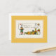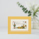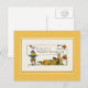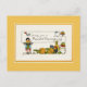 En söt Pilgrim håller en kalkon på en platter med en skörd av pumpor och viner, en kalkon i vilden, en höstack i guld, en stuga i land och fruktsorter. Hälsning: Önskar en fredlig Thanksgiving. Bild av Vintagen Penny Postcard från 1919 på guld-bakgrund.