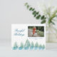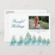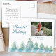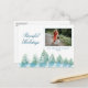 Fredligt Winter Forest Watercolor-skript Foto-jul-Helgdag-vykort. Vattenfärgen teckning i träd på vintern, vinterskogen med snö i blått och grönt färg. Utformningen är fredlig och lugn med text på framsidan och insidan i elegantens skript. Anpassa med foto och text.