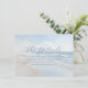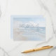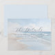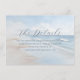 Det här brölloppskortet har en lugn strandscen med mjuka vågor och en mjuk blå himmel som skapar en lugn och avspänd atmosfär vid havet. Den minimalistiska designen använder lugnande blå, vita och ljust beige toner, förstärkta av en drömlik, lätt suddig effekt för en eterisk kvalitet. Elegant skrivstilstypografi framhäver "Detaljerna", medan rak sans-serif-text ger information om boende och hänvisar gästerna till brölloppswebbplatsen. Layouten är balanserad och modern och använder det tomma utrymmet effektivt för att leda uppmärksamheten smidigt från titeln till detaljerna, vilket gör den både visuellt tilltalande och informativ.