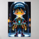 En futuristiska, animerad robot som fredsbevarande pojke står inuti en glasdomän med glödande mekaniska detaljer och pulserande färg. Det barnlika figur har ett runt ansikte och ett intrikat, belyst kostym med synliga växlar och kretsar.