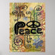 Fred poster med handskrift i svart, fredstecken och en färgstark bakgrund av en abstrakt vattenfärg. Ett originalverk av Angela Hoard-Dunn.