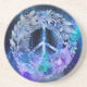 blad och blomsterkrans på en fredssymbol med stjärnhimmel och himmelska drömmar. Fredsdrömmar. Färgtema - marinblå, lila och akvagrön