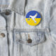 Knappen krig i Ukraina med en vit duva som bär ett olivträd gren på blå och gult ukransk flagga.