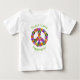 Den här t-shirten har fredsteckenet blommigt i nyanser av rosa, gult, orange, lila, grönt, vit, svart och turkos. "Fred, kärlek och lycka" omger fredsteckenet.