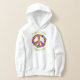 Den här sötningsskjortan har ett fredstecken i blommigt i nyanser av rosa, gult, orange, lila, grönt, vit, svart och turkos. "Fred, kärlek och lycka" omger fredsteckenet.