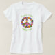 Den här kvinnans t-shirt har ett fredstecken i blommigt i skuggor av rosa, gult, orange, lila, grönt, vit, svart och turkos. "Fred, kärlek och lycka" omger fredsteckenet.