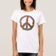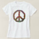 Ett färglöst fredstecken/fredstjorta t-shirt med slit-dye färg och ljusa färgader blommor över det. En lysande, glad blommigt-design för stolta hippies/älskare av världsfreden.