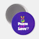En magnet för coola i funky med fred och kärlek skriven i ett typsnitt av typen groovy. Bilden är en handformad fredssymbol, finger upphöjt i det klassiska v-tecknet som alla är tillverkade i regnbåge i färg. Ett litet dodlhjärta bredvid ord kärlek. Psykedelisk tillväxtdesign. Bakgrund för surt lila.