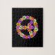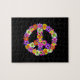 Det här pusslet med boho-pussel har ett fredstecken av blommigt i skuggor av rosa, gult, orange, lila, grönt, vitt och svart.