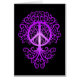 Denna utarbetada purpurfärgade träddesign presenterar symbolet för fred i mittet av flödande stam- grenar. Stort rotar spridning ut ur grunden av detta symmetriska mönster med stamspringet upp mittet. Träd sitter på en ren svart bakgrund som skapar en bedöva kontrast. Grenarna och rotar göras upp av delikat virvlar runt och linjer som kommer tillsammans att skapa en stilfull kortdesign.
