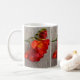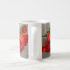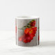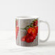 Fläckiga blommor av orange/röd frisisk på träbakgrund. Det här fotot upprepas tre gånger runt mugg för en ögonetsande design på varje vinkel.