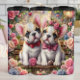 This charming digital illustration features two adorable French Bulldog puppies sitting side-by-side on a rustic wooden bench. The puppy on the left wears a classic red bowtie, while the puppy on the right is adorned with a beautiful pink rose crown and a matching floral bowtie. They are surrounded by a lush, romantic garden filled with large blooming roses in shades of pink, white, and blue. Soft golden light glows in the background, complemented by floating red hearts and a vintage-style garden lamp. This seamless-style graphic is designed as a full-wrap for insulated tumblers, providing a high-impact, 360-degree visual experience. The sweet character design and elegant floral aesthetic make it a perfect gift for dog lovers, Valentine Day, or anniversaries.