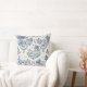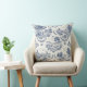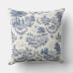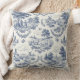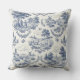 This pillow features quaint blue and cream toile de jouy illustrations of the countryside.