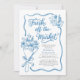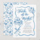 Delicate blue florals, hand-drawn line art, and graceful script typography create a timeless European aesthetic that feels both refined and effortlessly playful. The bouquet illustration symbolizes love in full bloom — beautifully wrapped, carefully chosen, and ready to be celebrated.