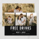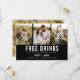 Lustigt bröllop spara datum-kort i en modern, tre fotosvart design som lyder "Fria drycker och vi är gifta sig". Anpassa kortets framsida med 3 av dina foton och bröllop-förlovningar. Du kan också lägga till ett vågrät-foto på baksidan.