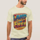 "Land of the Free" t-shirt-designen har en fetstilt, vintage-inspirerad grafik med frasen "Land of the Free" på en framträdande plats i patriotic färg. Texten är formaterad med ett gammaldags serif-typsnitt, och designen innehåller subtil stars och stripes för att framkalla en känsla av amerikanskt pride och arv.