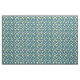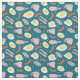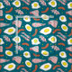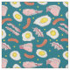 Mörk blått väv med roligt mat mönster av stekta frukthög, bacon och korv