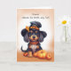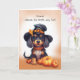 Önskar din vän en "Howl-oween"-fullt av leenden och roligt med det här vackra kortet! Inuti, en lovvärd svart och brun hund, sport en rolig häxhatt, står mitt i lekfulla pumpor. Den mjuka vattenfärgen tvättar stollig lite och det fallna löv på hatten ökar kortets skärpa. den här förvåningen och berätta för din vän att du tänker på dem på den här speciella helgdag.