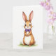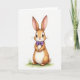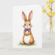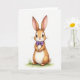This greeting card features an upright rabbit with caramel-toned fur centered on a white background, offering a friendly, attentive presence 🐰. Its tall ears show soft pink on the inside, and its bright eyes and small pink nose give it a sweet, welcoming look that feels like a quiet hello between close friends. A lavender bow tie sits neatly at the neck, adding a soft pop of color against the warm fur. The rabbit’s front paws are gently clasped, like it’s holding back a shy smile meant for someone special. Any greeting text is placed above the rabbit in a light lavender tone, with a smaller line set below in a muted gray for balance 🌷. The artwork has a soft, watercolor-like texture with gentle shading rather than sharp lines. At the bottom, a few small tufts of green grass ground the figure without crowding the open space.