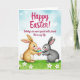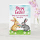 This design shows two upright long-eared animals facing each other in the lower middle of the scene, their gentle expressions and slightly tilted heads suggesting close friendship 🐰. Behind them, a soft wash of blue-green sky fades into a light blush near the horizon, giving the setting a calm spring morning feel. The left figure is a warm tawny color with rosy cheeks, holding out a patterned oval token toward the right figure in a tender, offering gesture. The right figure is a quiet grey with a small fluffy white tail, looking back with an attentive, trusting gaze. Across the upper sky, a seasonal greeting appears in fuchsia hand-lettered text, spaced widely so it floats above the pair without crowding them. A smaller line of text sits below in a darker, muted tone, centered near the lower area to read as a gentle follow-up message. Along the bottom edge, bright green grass is dotted with small white-petaled flowers 🌷. The oval token between them has candy-like stripes in electric blue, sunny yellow, and vivid pink.