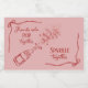 This playful champagne celebration design features a soft pink background with bold red typography and charming hand-drawn details throughout. A popped champagne bottle sits diagonally at the center, bursting with fizz, confetti, and festive energy, while coquette bow corners add a sweet, feminine touch. The phrase “Friends who POP together SPARKLE together” is styled with Ace Serif for emphasis on the celebratory words and flowing Avelane script for a graceful contrast.