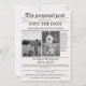 Minimalistisk frieri tidningen bröllop spara datum efter skript med tre foto, ett foto av brudgummen och bruden när de var barn och när de växte upp.