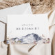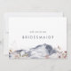 Detta enkla frieri kort för bergsbruden i blommigt är perfekt för ett utomhusområde bröllop. Den moderna minimalistiska utformningen har ett marint, blått vattenfärgsberg med rosa moody snäckor. Anpassa kortet med namn på bruden och briderna. Anpassa kortets baksida med ett meddelande om personlig.