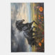 En slående svart friesisk häst galopperar bland levande vilda blommor, med en dramatisk stormig bakgrund i himmel som ger en känsla av makt och elegans.
