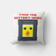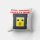 Denna kudde vid fantastisk har ett mycket allvarligt budskap. Utformningen har en liten chick gult med söt, liten svart ögon och en orange som går ut och tittar ut från baksidan av en fyrkantig bur i metall. I texten står det att batterihönsen ska vara gratis. Det återspeglar mina personliga problem med hur djur hålls och exploateras för mänsklig använda i hela världen.
